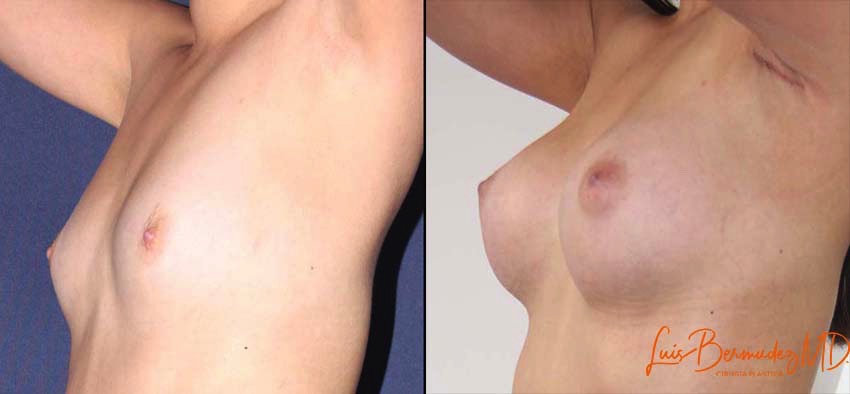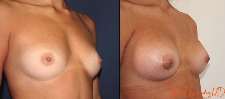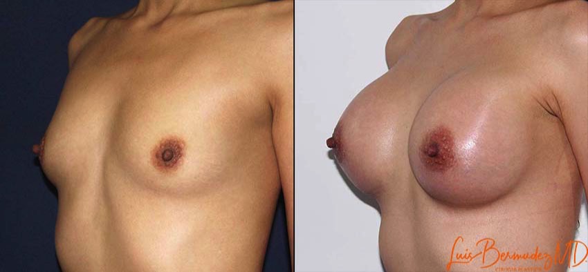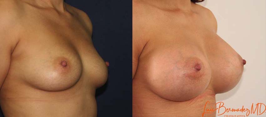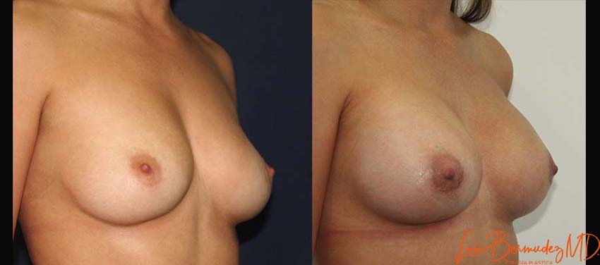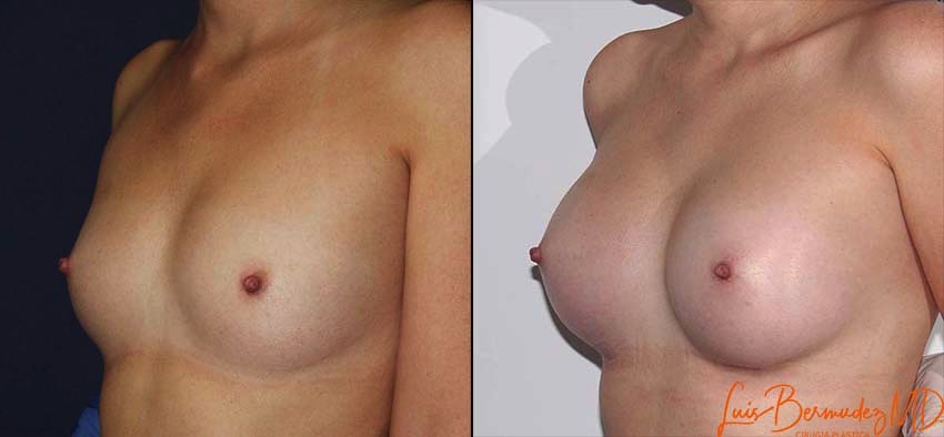 En las siguientes fotografías se puede ver el cambio después de colocar unos implantes de 550 cc a través de una incisión peri-areolar (los 180 grados inferiores de la areola)