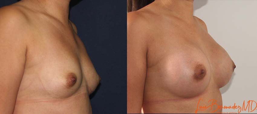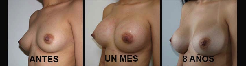 En las siguientes fotografías se puede ver el cambio después de colocar unos implantes de 550 cc a través de una incisión peri-areolar (los 180 grados inferiores de la areola)